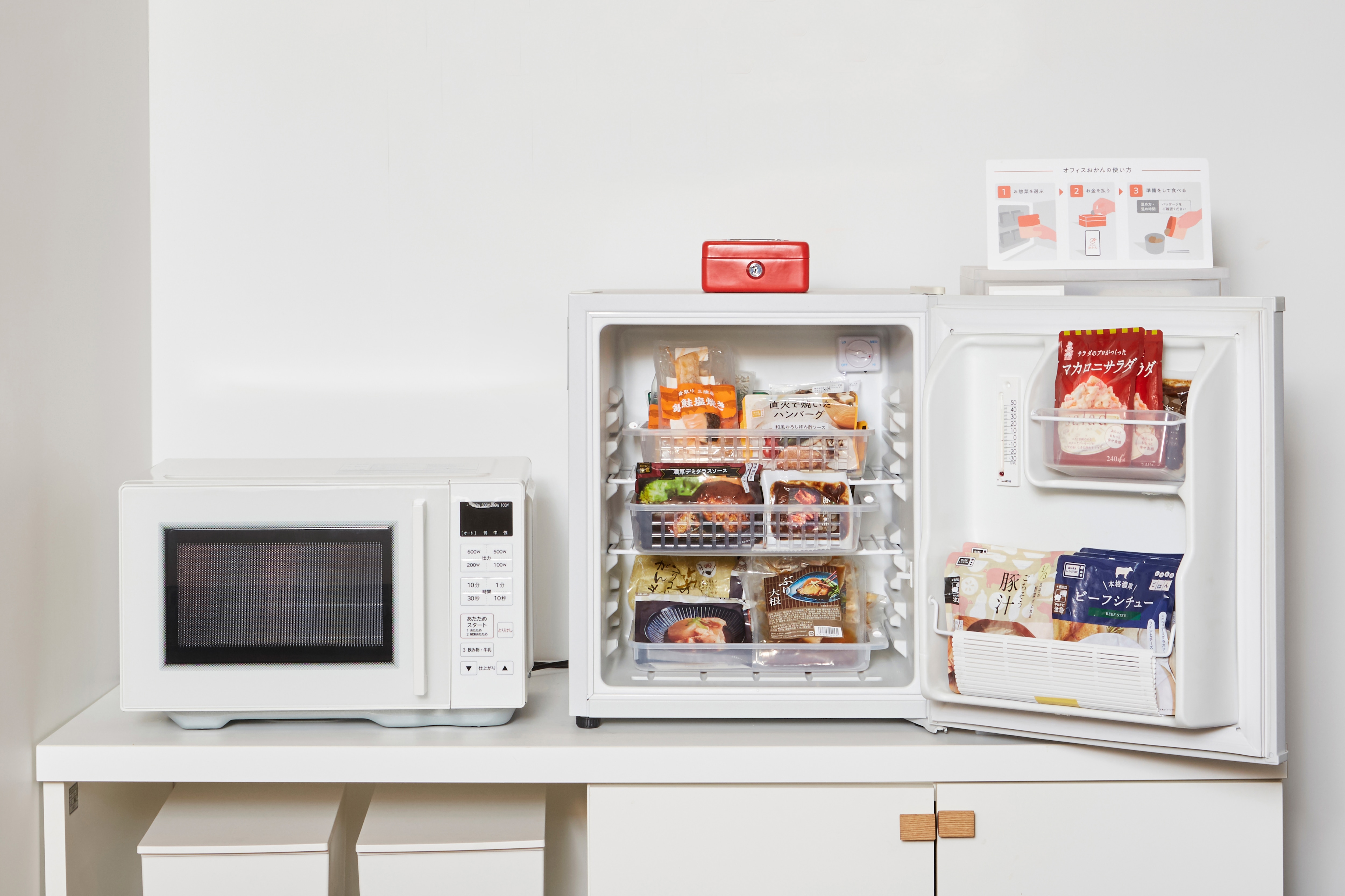 導入企業様に準備いただくのは設置スペースと電子レンジのみ。料金箱や専用冷蔵庫、資材(使い捨てのお皿、お箸、スプーン)、資材ボックスはご提供します。