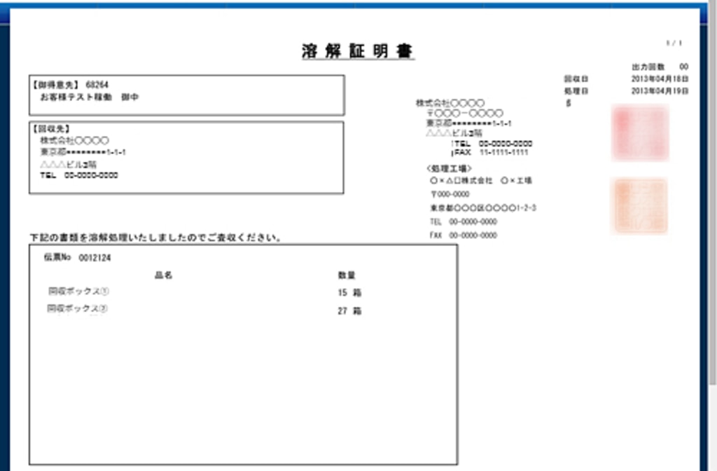 回収時に貼付した二次元バーコードの情報を基に、「溶解証明書」を発行致します。