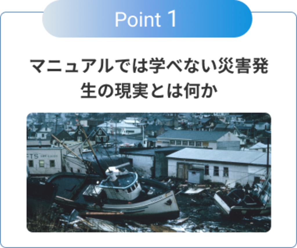 本セミナーでは、過去の様々な災害で実際に起きた事象の追体験(シミュレーション)を通じて、