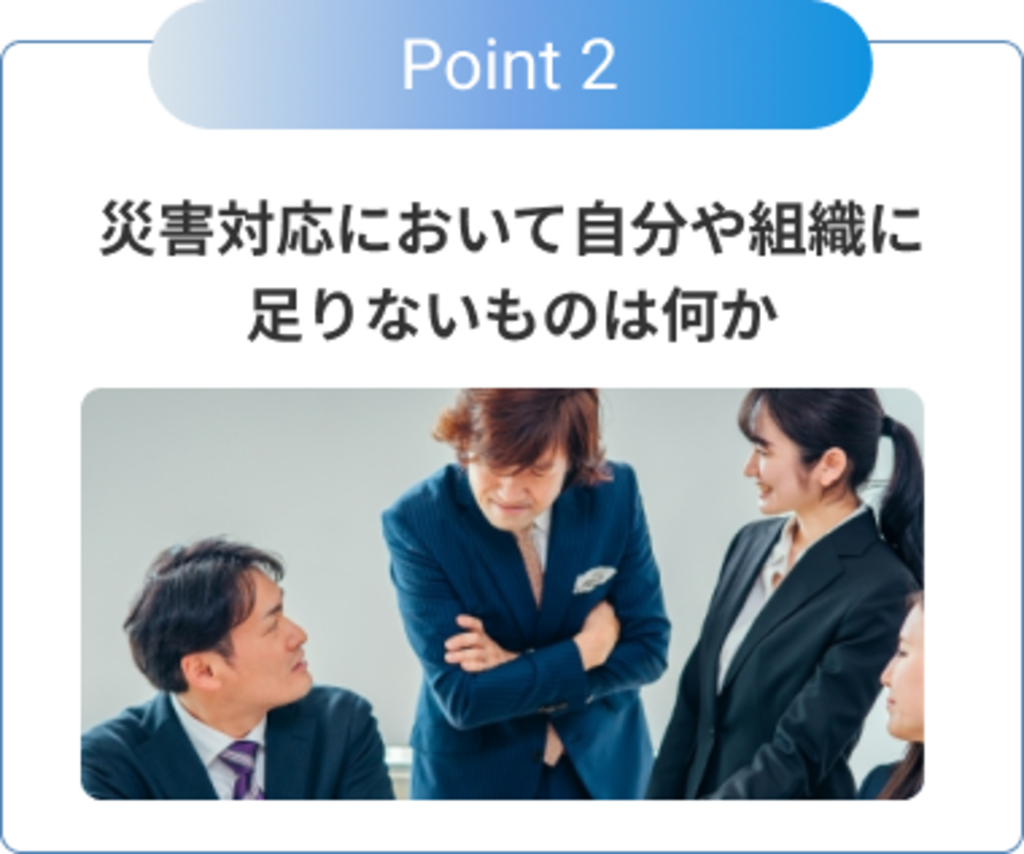 テレワークが進み、災害が起きた時に防災担当がオフィスにいるとは限りません。その場にいる人だけでなんとかしなくてはならず、災害対策を防災担当に任せっぱなしにしてはいけないことを痛感しました。【情報通信】